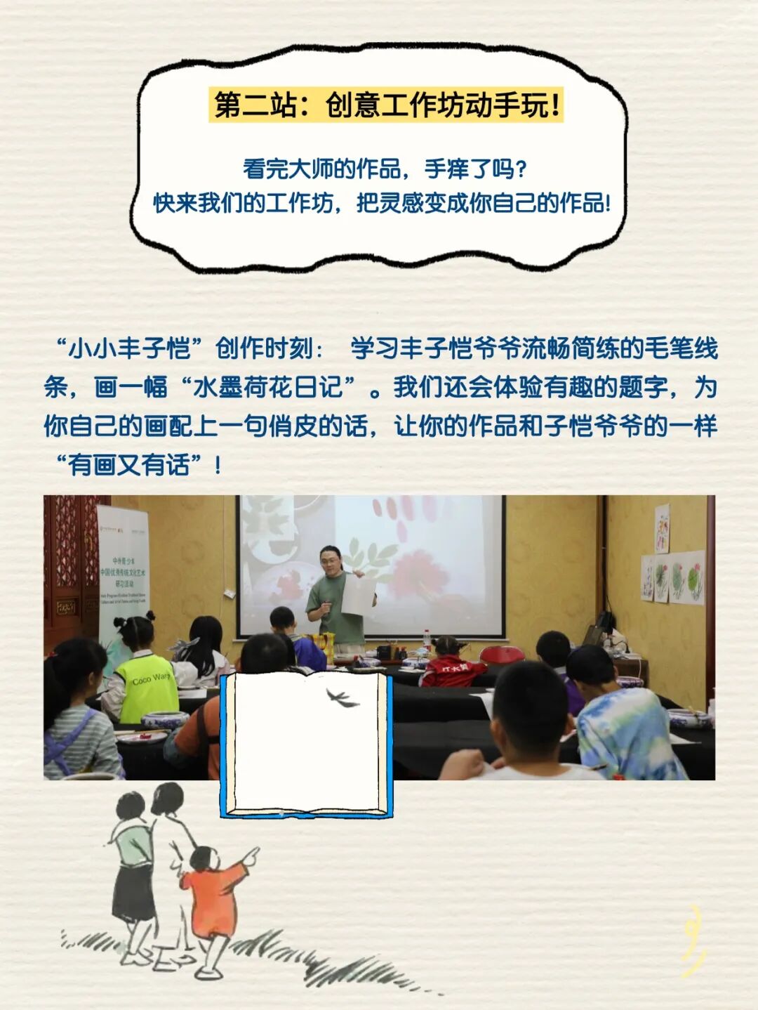 在专业导师的带领下与大师真迹对话,感受中国文人画的魅力与现代表达的结合,提升审美素养。在工作坊学习丰子恺爷爷流畅简练的毛笔线条,画一幅“水墨荷花日记”。