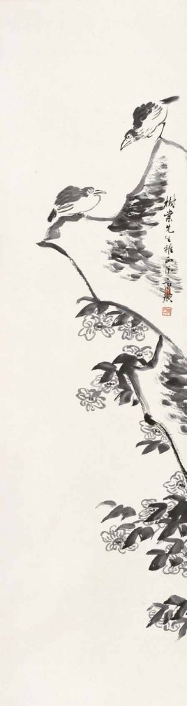 石上双鸟 齐白石 无年款 156.5cm×41.5cm 纸本设色 北京画院藏