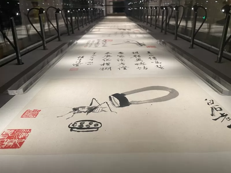 齐白石之学,远非止于三家。展览特别设置了翻翻墙,“齐白石的师承谱系与笔墨再生”互动装置,将齐白石在题跋当中提到的前贤一一呈现,包括沈周、唐寅、董其昌、石涛、金农、黄慎、李鱓等明清写意名家,直观展示了他博采众长的艺术脉络。