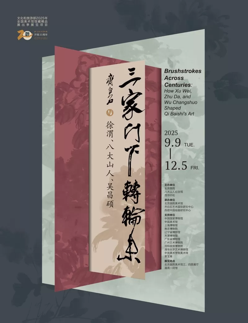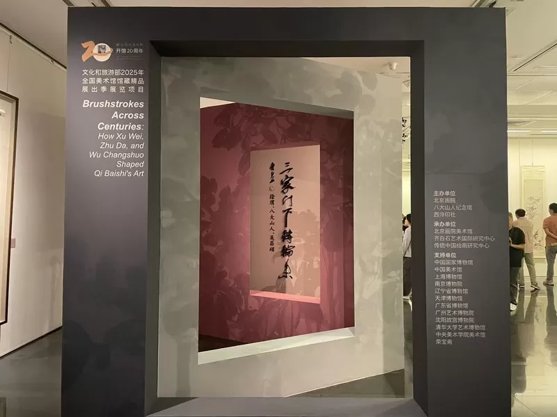 2025年9月9日至12月5日,由北京画院、八大山人纪念馆、西泠印社联合主办的“三家门下转轮来——齐白石与徐渭、八大山人、吴昌硕”展览在北京画院美术馆展出。展览联合了中国国家博物馆、中国美术馆、南京博物院、辽宁省博物馆、天津博物馆等十余家国内重量级文博单位,历时数年筹备,以齐白石对三家的致敬与师学为轴,展出了徐渭、八大山人、吴昌硕、齐白石作品70余件套,通过“百代同辉”“萍翁造化”“缶庐铁笔”“青藤雪个”四个单元,梳理了中国大写意花鸟画自明清至近现代的源流与风格演进。