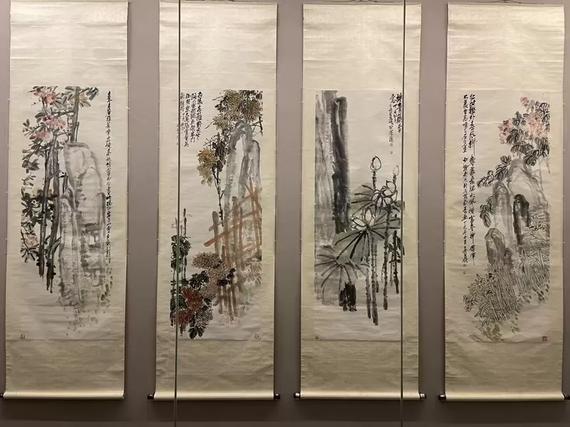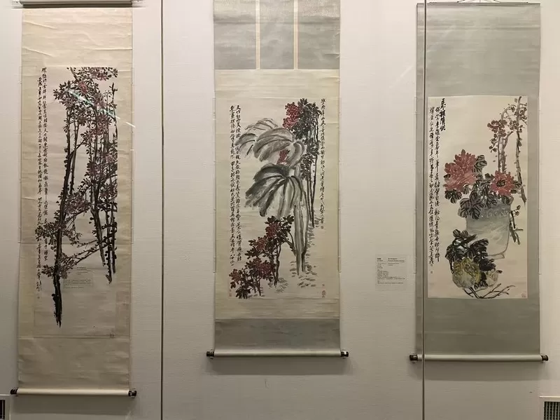 展览打破了传统线性叙事的策展思路,从齐白石出发,回溯至吴昌硕、八大山人、徐渭,铺陈出大写意花鸟画数百年的精神谱系。值得一提的是,展览主视觉以“三重门”为设计灵感,每扇门分别以四家的牡丹为背景,门门相扣,如同大写意的代际传承。