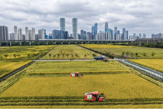 2025年10月21日,收割机在浙江省杭州市萧山区世纪田园粮食功能区的稻田里收割水稻,远处高铁列车飞驰而过(无人机照片)。(徐昱 摄)