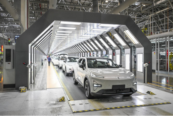 这是2025年1月9日在位于重庆市渝北区的长安汽车数智工厂总装车间拍摄的即将下线的新能源汽车。(王全超 摄)