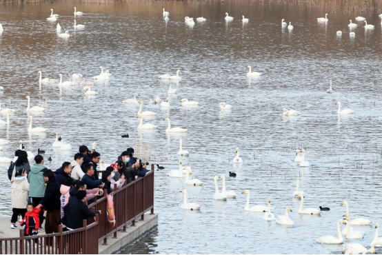 2025年12月20日,游人在河南省三门峡市天鹅湖国家城市湿地公园观赏天鹅。(牛书培 摄)