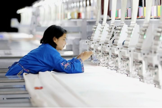 2026年2月24日,工人在贵州省黔东南苗族侗族自治州施秉县一家数字化苗绣企业生产车间赶制订单产品。(邰胜智 摄)