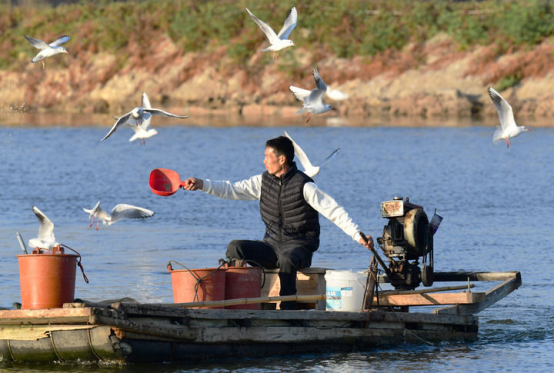 2025年12月10日,福建省漳州市佛昙镇东坂村河豚养殖户在给河豚投喂食物。(魏培全 摄)