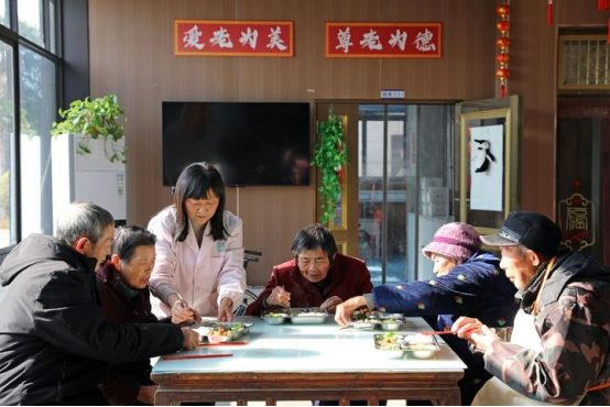 2025年12月28日,护理人员在江苏省海安高新区隆政街道德兴村亲上亲养老小院照顾老人用餐。(顾彬斌 摄)