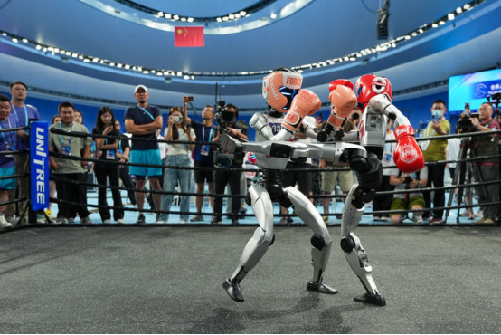 2025年8月15日,在北京国家速滑馆“冰丝带”举行的2025世界人形机器人运动会上,来自奥林1队的人形机器人(右)和北科/武汉大学联队的人形机器人在自由搏击赛比赛中。(鞠焕宗 摄)