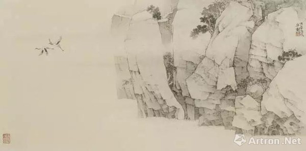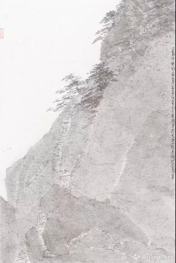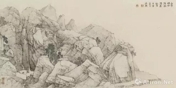 徐钢的作品直承新金陵画派亚明先生,但是他又别出心裁、自出机杼,在淡墨轻岚之间讨生机,把施墨与用皴用完全另外一种方式与山石云水形象的塑造结合起来,淡墨之中隐现出山峦的结构、骨骼与脉络,以轻写重、举重若轻,意味与境界反而更加醇厚含蓄、真意鼓荡,在虚实有无之间生出无穷的气韵。