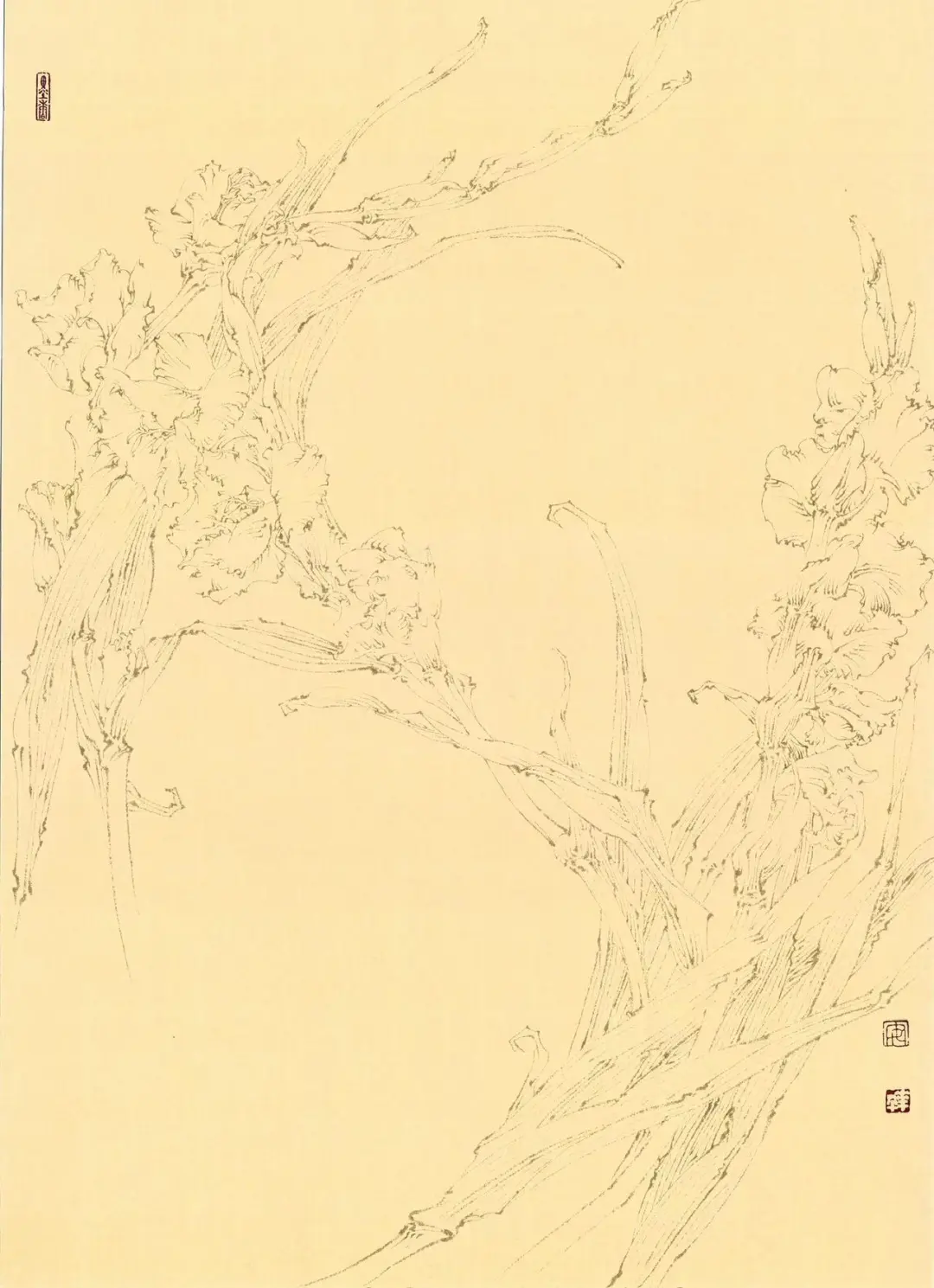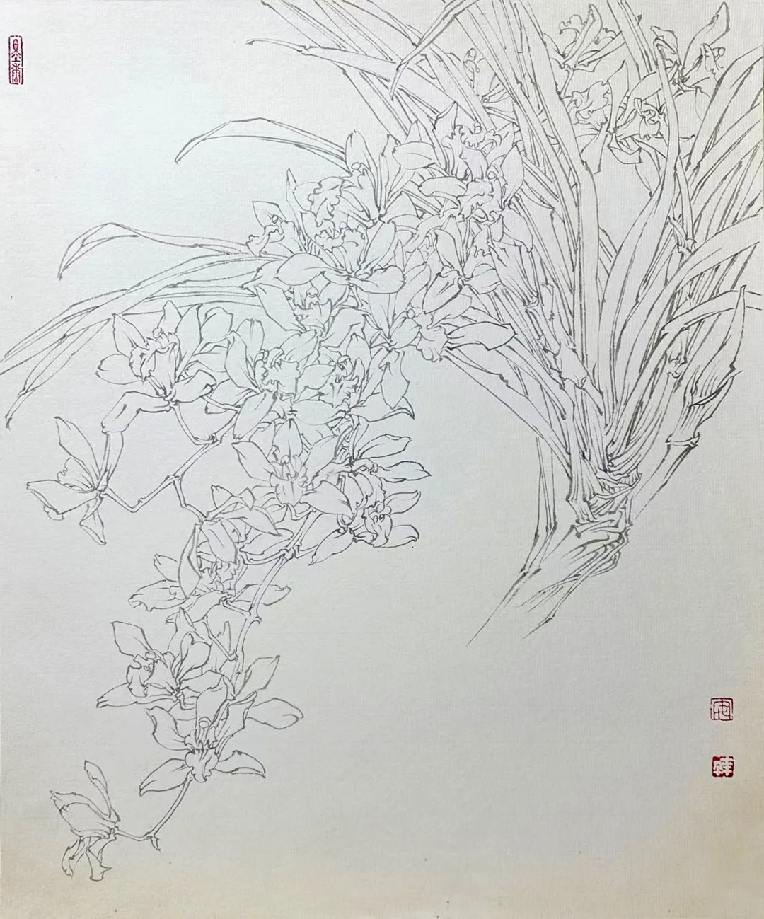 线,是中国画造型的根基,亦是传神写意的灵魂。它不仅是构成画面的骨架,更是东方绘画形式美感与笔墨意蕴的核心语言。线描花卉,贵在以简约之笔捕捉自然生机——花瓣之柔美、叶脉之舒展、枝干之苍劲,皆于线条的起承转合、疏密虚实中一一呈现。