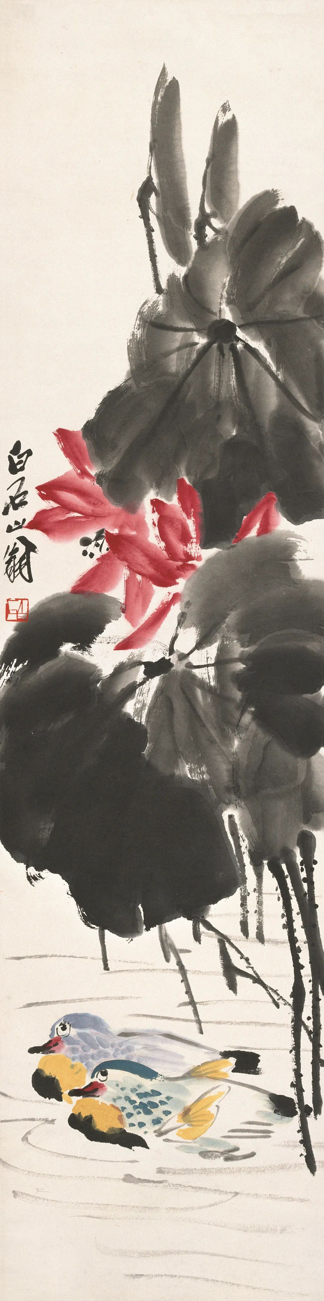 红荷鸳鸯 齐白石 133cm×33cm