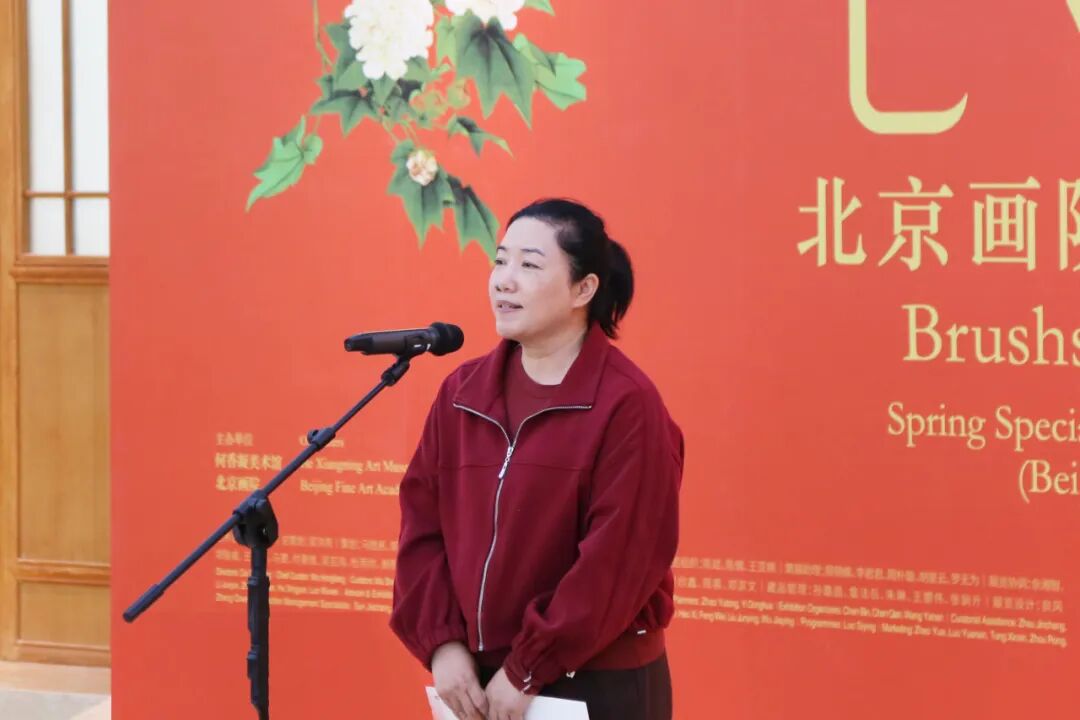 随后,深圳市文联党组成员、专职副主席金琇致辞并宣布开幕。她在致辞中表示,何香凝美术馆作为深圳重要文化窗口,长期通过高质量合作展览持续丰富深圳文化艺术氛围、提升公众审美。本次展览系统呈现近现代花鸟画精品,既展现花鸟艺术“一花一世界”的微观妙趣与精神象征,更以笔墨丹青寄托对和谐盛世的美好祝愿,生动诠释中华优秀传统文化在新时代的蓬勃发展。她进一步表示,这些经典艺术精品不仅为深圳的文艺工作者与广大爱好者提供了宝贵的学习、借鉴与对话的机会,更在岁末之际,为深圳增添一抹新春气息,预示着新一年更好的景象。