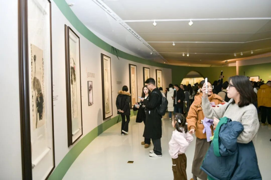 在白石书屋内,许多观众在电子屏书桌前驻足,在书法交互桌前体验书法创作的乐趣。“假期带孩子来感受艺术氛围特别有意义。”带着孩子观展的市民王蕾表示,“既能欣赏大师真迹,又能参与互动活动,比单纯的游玩更有收获。”