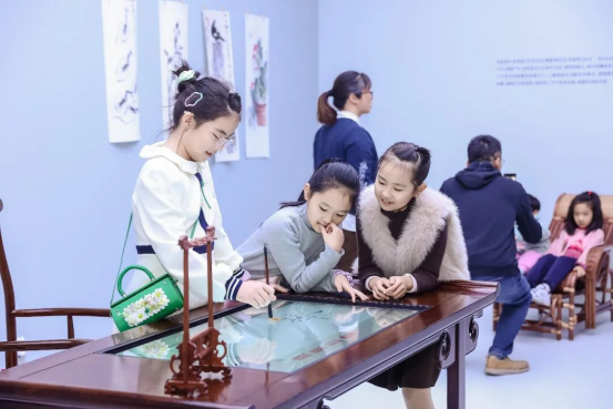 孩子们在“白石画屋”区域挥毫书写,留下自己的作品