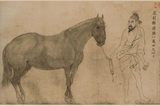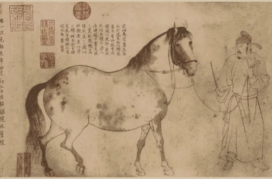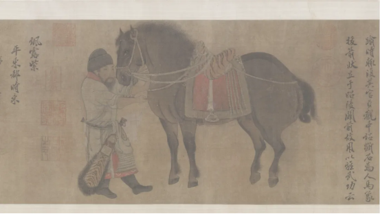 《五马图》是北宋画家李公麟创作的纸本设色绘画作品。五匹西域进贡的绝世骏马,在奚官牵引下静立如松,骨肉匀停,风神俊朗。李公麟以“白描”圣手,仅用墨线就勾勒出马的肌肤弹性与内在力量,堪称“以线立骨”的巅峰之作。