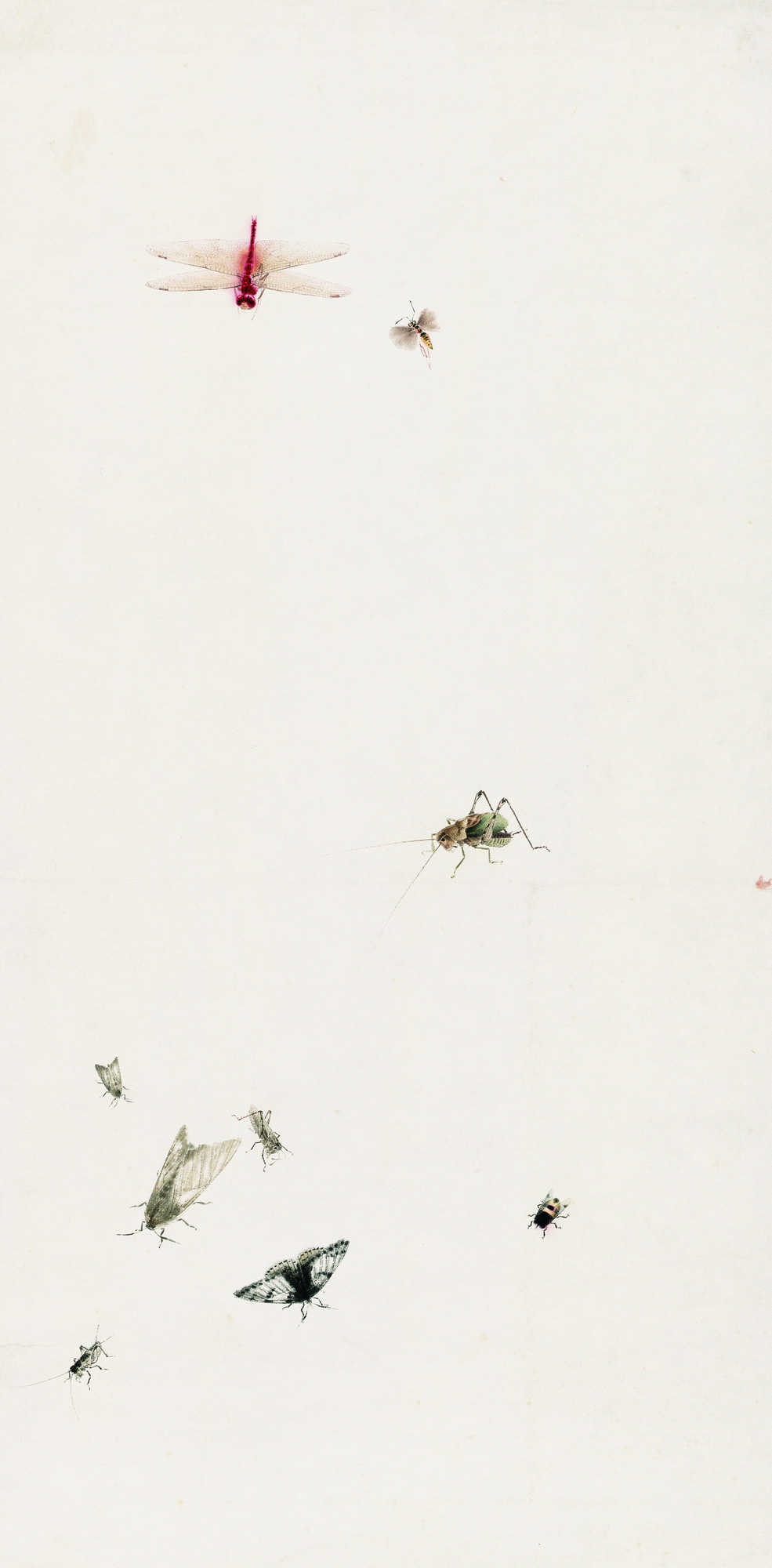 有学者曾说:齐白石一生画过的草虫种类超过了以往的所有画家。其中包括蜻蜓、蚂蚱、蛾、蝉、螳螂、蝈蝈、蜂、蝇、蝼蛄、灶马、蝴蝶、蟋蟀、草青蛉、蜘蛛、土元、甲虫、荔蝽、蝽、瓢虫、天牛、豉甲等几十种。白石老人笔下的草虫或精致入微,或写意传神,无论工或写,皆形神兼备,栩栩如生。甚至有些种类的草虫还画出了下属不同科类,比如蛾类,涵盖灯蛾、凤蛾、尺蛾、天蛾、鹿蛾、螟蛾、蚕蛾、雀天蛾等;蜂类,涵盖蜜蜂、马蜂、胡蜂、熊蜂等。它们之间细微的差别,都被画家精准捕捉。虽然齐白石不是昆虫学家,或许也无法准确叫出各类昆虫的名称,但他对这些弱小生命的特征却有着极为准确的把握。这源自画家对自然的悉心观察,也是其草虫作品的魅力所在。展览第一次全品类展出了齐白石的草虫作品,并置有昆虫标本与图鉴,为齐白石艺术研究与欣赏提供了全新的视角。
