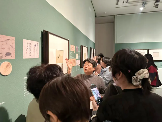 体验活动结束,众人移步北京画院美术馆,在工作人员的导览下,细致参观了“问虫:齐白石的草间对话”展览。从篆刻的刻划意趣到绘画的草虫精微,展览以另一种叙事角度,呈现了齐白石艺术世界的丰富内涵。观展期间,一行人凝神聆听导览讲解,驻足细观画中的纤毫笔墨,在展厅内打卡留念,以镜头记录艺术点滴。行程尾声,参观团至美术馆四层积学书屋选购文创,为这场跨界之行画上余韵悠长的句号。
