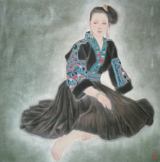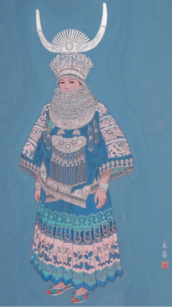 工笔重彩人物是蒋先生的创作核心,她扎根传统,深耕技法精髓,传承古人“骨法用笔”的线条力量与“随类赋彩”的设色智慧,将民族风情与人文精神融于笔端,线条精微、色彩沉厚,兼具古典法度与现代审美,尽显工笔重彩的精神高度。